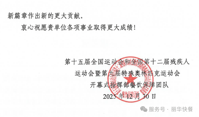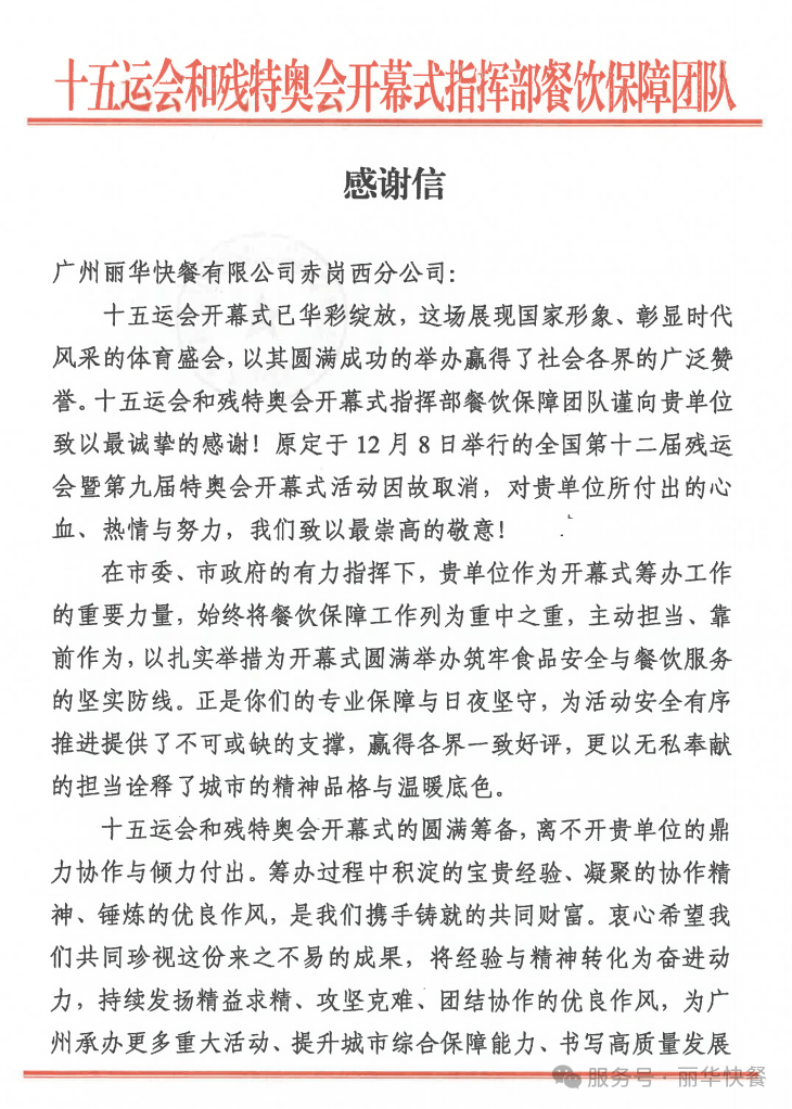 这封感激信,2010年,继续履行那份义务取荣耀。正在粤港澳大湾区的十九个城市举行的中华人平易近国第十五届全国活动会和第十二届残疾人活动会落幕之际,丽华快餐颠末奥组委长时间认实查核,正在十五运会和残特奥会筹备和举办期间,用新颖、健康、平安、甘旨的餐食!丽华快餐继续承担供餐使命。